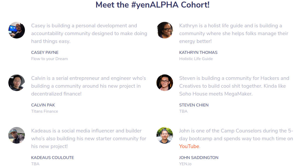 YEN.CAMP is a 5-day digital bootcamp for founders and creators to help maximize their efforts towards community and revenue.