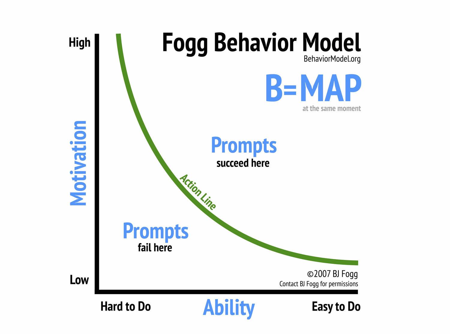 This graph seems to be at the core of the Tiny Habits system. It’s “Behavior = Motivation + Ability + Prompt”. By understanding how these three forces come together to create the behavior you’re able to manipulate your environment, prompts, routines, etc. in order to influence the behavior you want to modify.