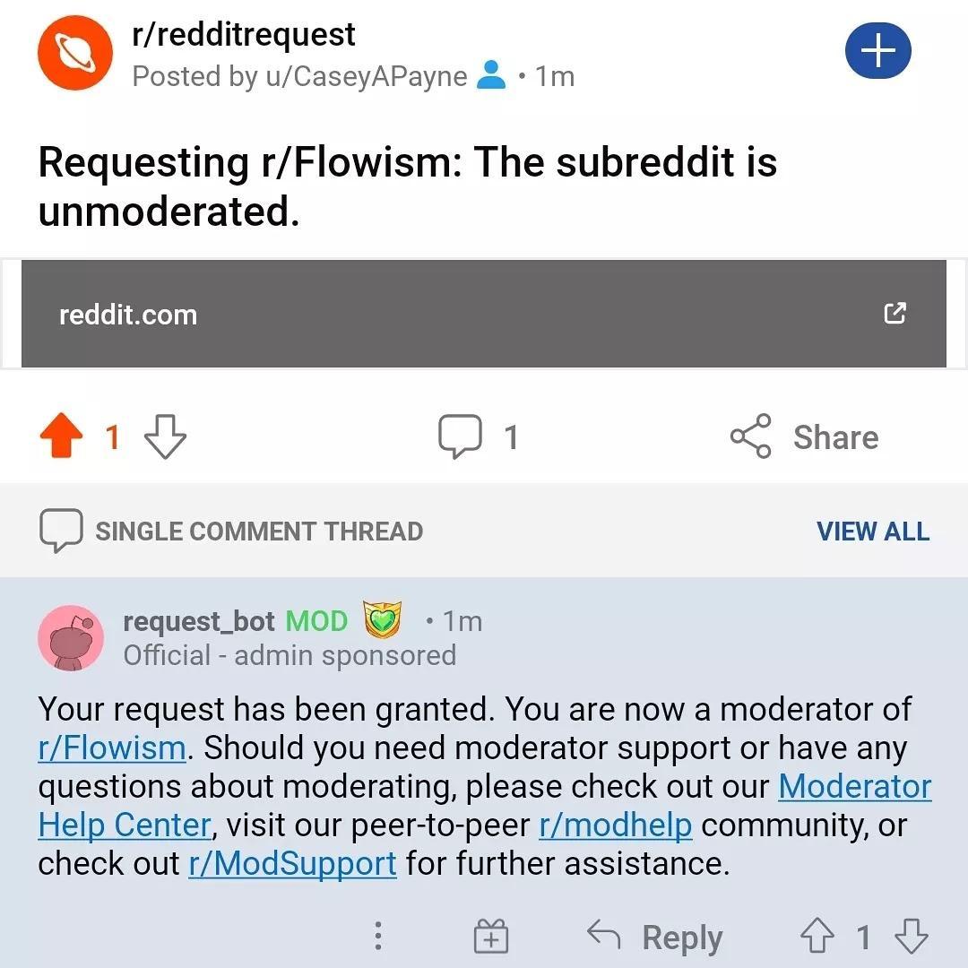 Since I was doing my research on Reddit I decided to see what was at the Flowism subreddit (a subreddit is a discussion board focused on a topic). What I found was an empty page with a single post about Flowism being the next great political movement. After some clicking around I discovered that there was no moderator for the subreddit. There was just a link to request to become the moderator. I submitted a request and it was automatically granted. Now I’m the moderator of r/Flowism.