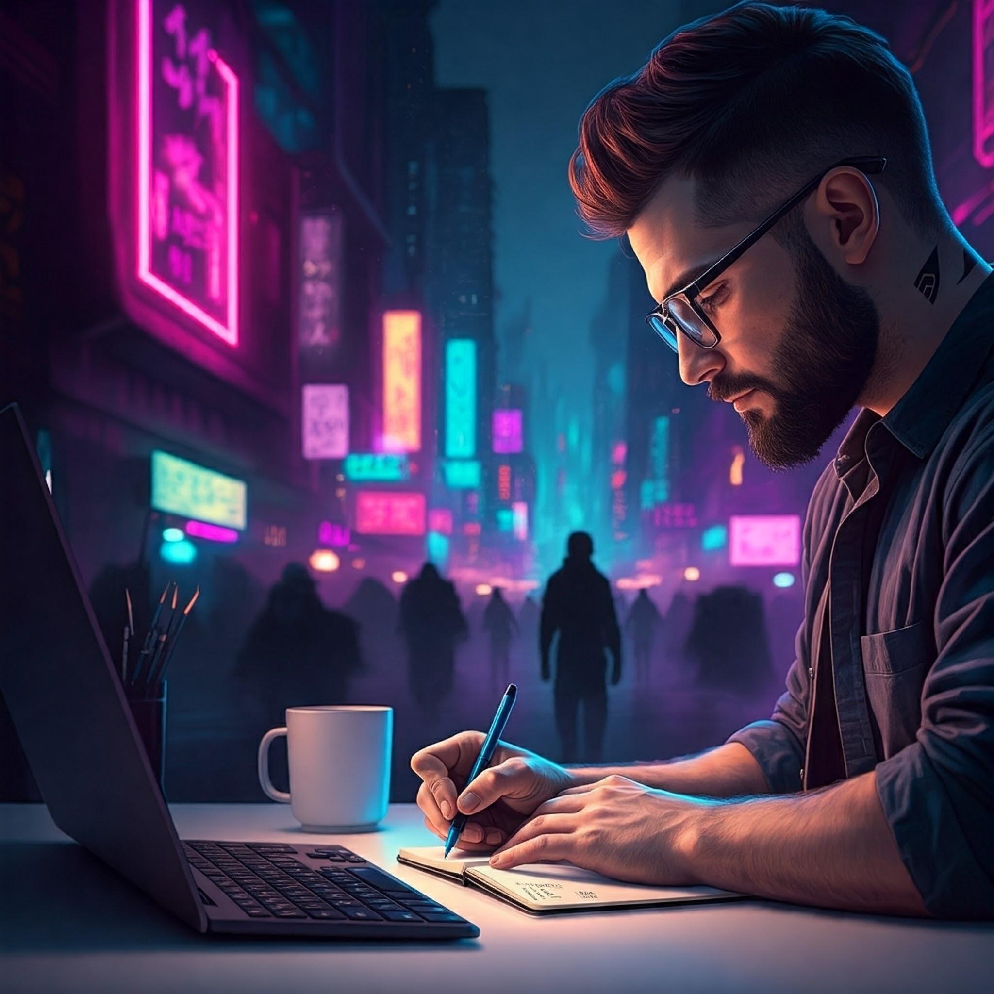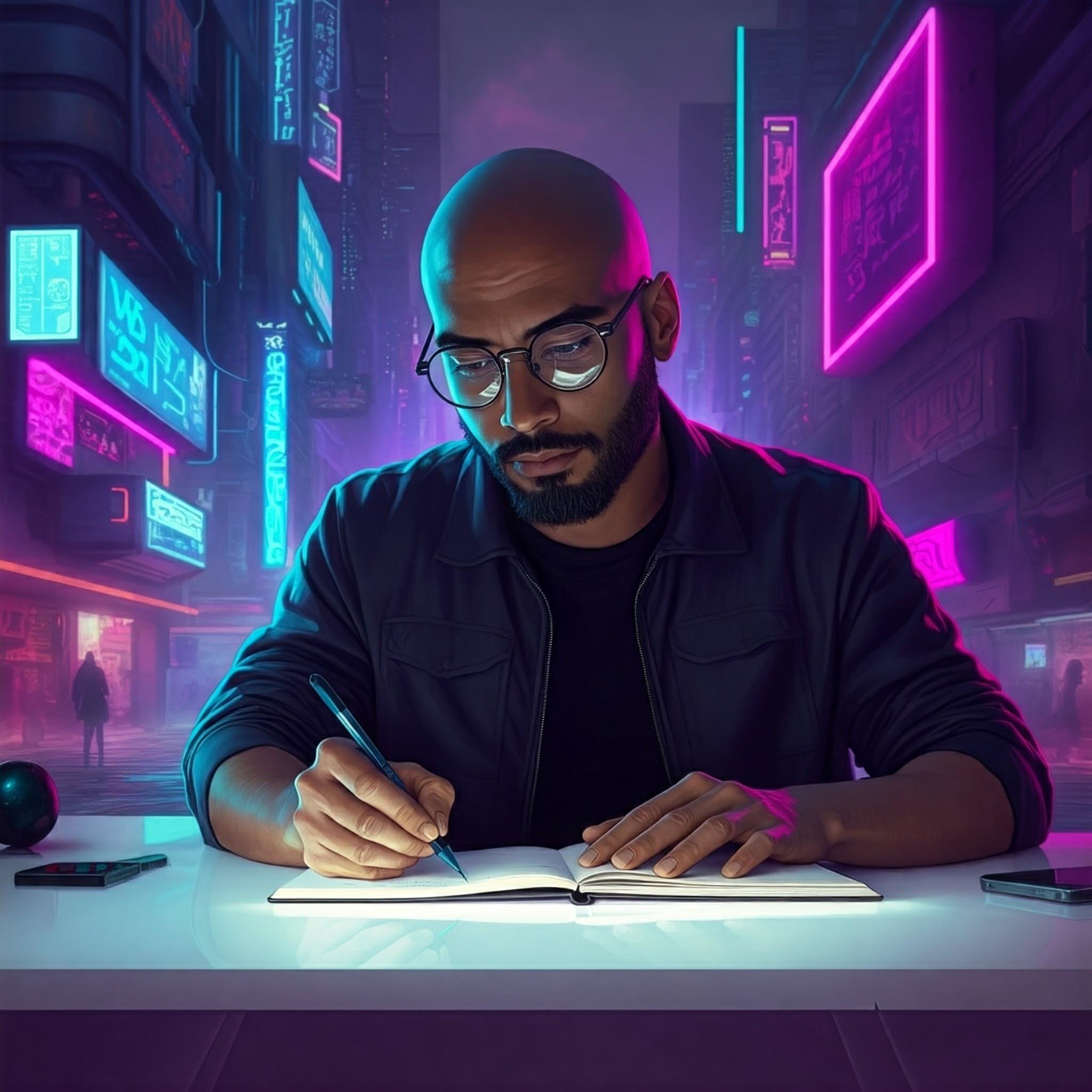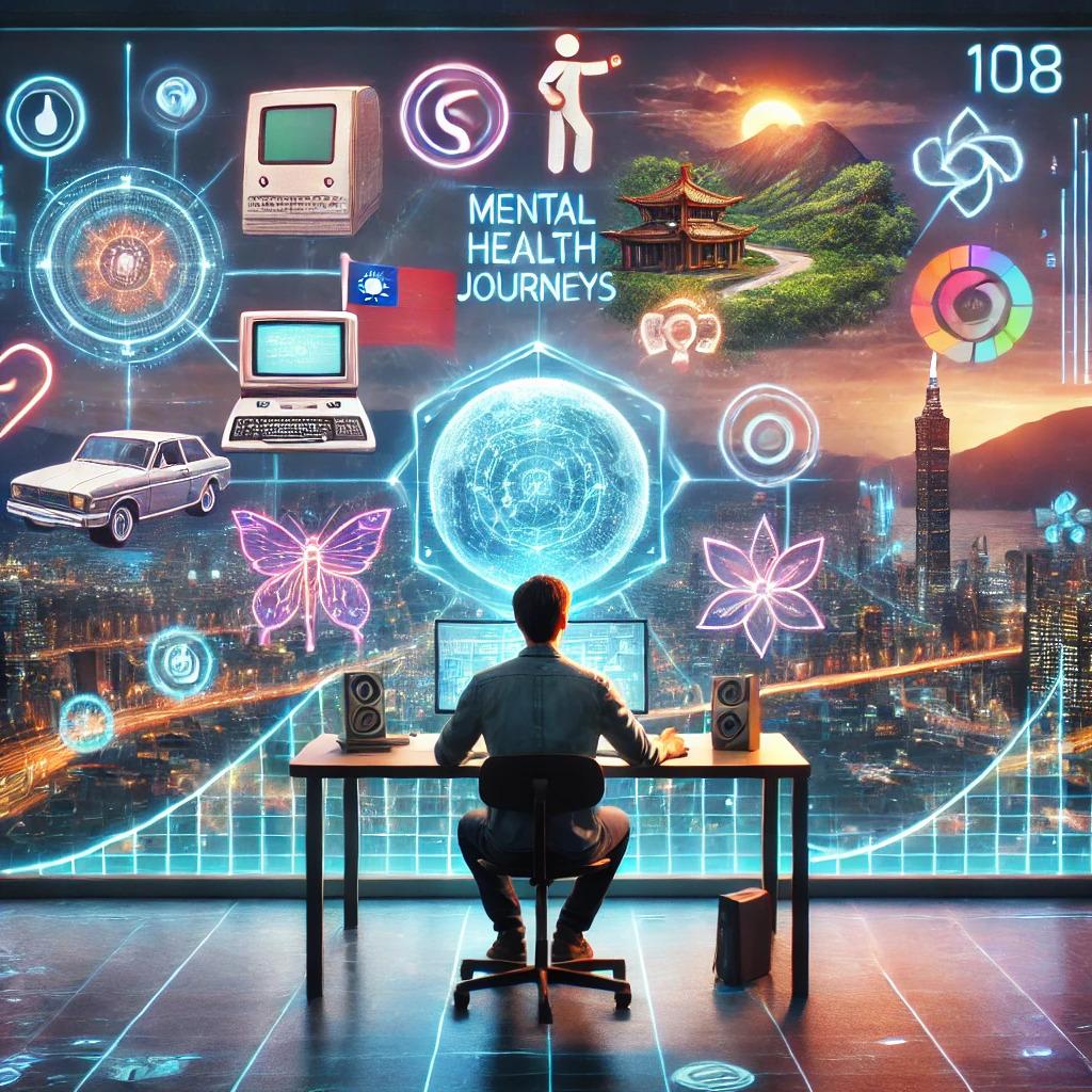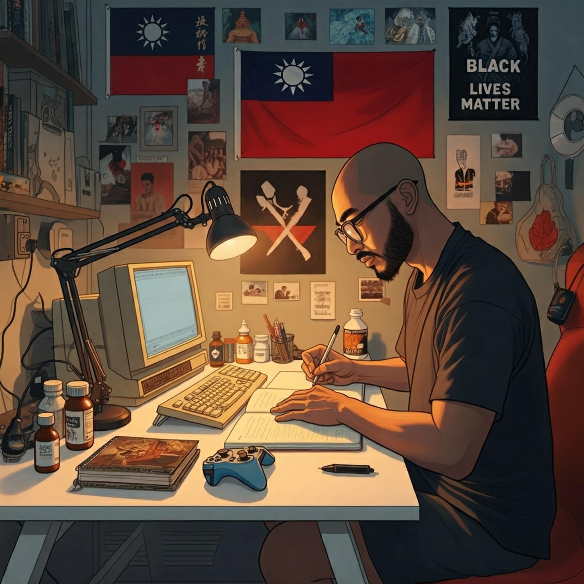 This is great. Instead of cyberpunk in the background, could you make it all of the different parts of life he’s thinking about? Things like his experience with technology from 1989 to now, his battle with bipolar 1, his experience with martial arts (tai chi and BJJ), his travels in Taiwan where he now lives, his experience being an activist for Black Lives Matter, his love of video games, etc.