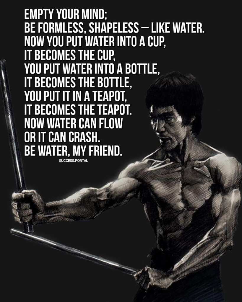 Flowism doesn’t have preset goals; you set them based on experience. Flowism is like water’s infinite adaptability—fitting any container. Our containers are shaped by genetics, family, culture, and environment. First, Flowism is about finding the philosophies, routines, rituals, and habits that fit in your container. It’s about finding your form. Only after mastering form can you master formlessness. You use Flowism to fill your cup, then you become the water inside. Bruce Lee’s quote about water captures the essence of high level Flowing.